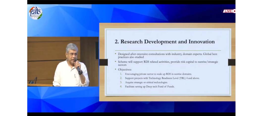 New Delhi : Union Minister Ashwini Vaishnav Said that in a transformative step to bolster India’s research and innovation ecosystem, the Union Cabinet, chaired by Prime Minister Narendra Modi, has today approved the Research Development and Innovation (RDI) Scheme with a corpus of Rs. One lakh Crore. He said that Recognizing the critical role that the private sector plays in driving innovation and commercializing research the RDI Scheme aims to provide long-term financing or refinancing with long tenors at low or nil interest rates to spur private sector investment in RDI.
