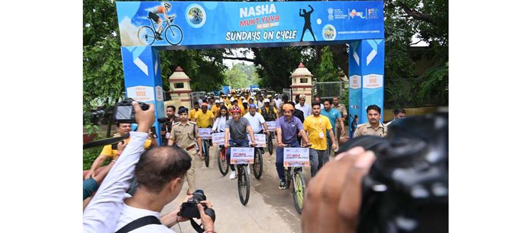 New Delhi : The 32nd edition of the Fit India Sundays on Cycle culminated in a grand celebration of fitness and a strong message against substance abuse with Union Minister of Youth Affairs & Sports Dr Mansukh Mandaviya riding a cycle along with a massive crowd of over 3000 individuals here at the Banaras Hindu University (BHU) campus in Varanasi.