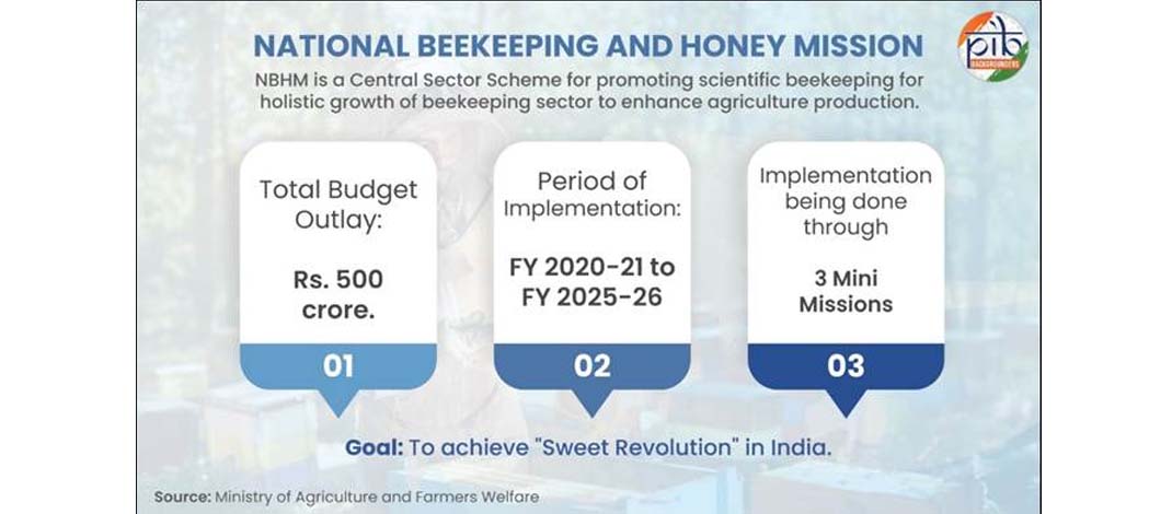- National Beekeeping and Honey Mission (NBHM) is a Central Sector Scheme for promoting scientific beekeeping for holistic growth of beekeeping sector. The goal is to bring about a “Sweet Revolution”.