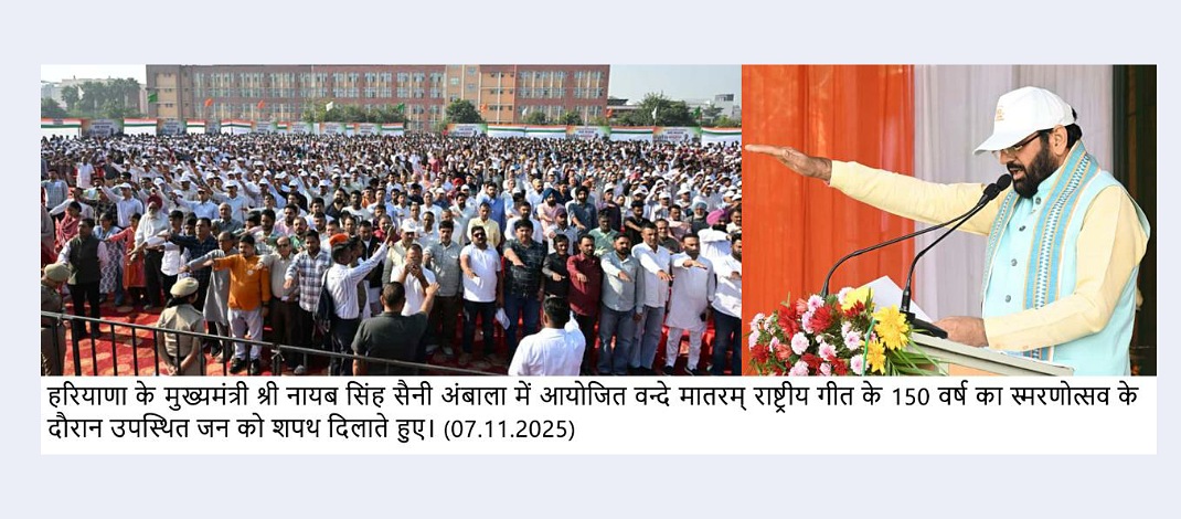 Sh. Nayab Singh Saini called upon everyone to take a pledge to make India a developed nation under the dynamic leadership of Prime Minister, Sh. Narendra Modi. Extending greetings once again on the 150th anniversary of Vande Mataram, the Chief Minister paid homage to all known and unknown heroes who sacrificed their lives for India’s freedom and its protection. Vande Mataram is the soul of our nation, our pride, our identity, he said.