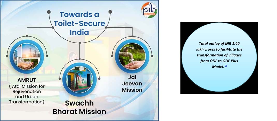 - Jal Jeevan Mission launched in August 2019, apart from providing safe and ample drinking water to all rural households, also focuses on sanitation & maintenance of open-defecation-free (ODF) villages.
