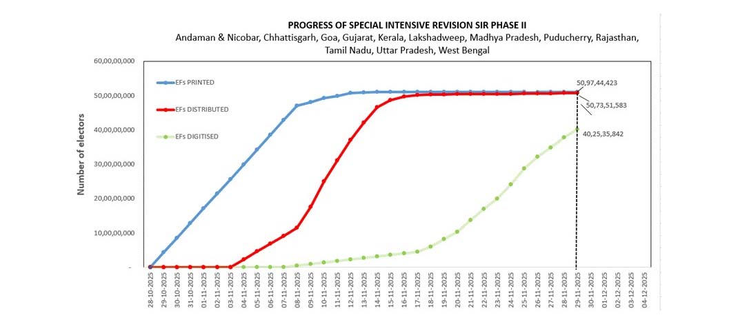 Overall, against 5,09,744,423 electors (as of 27 October 2025), a total of 5,07,351,583 EFs have been distributed, achieving 99.53% coverage. Digitisation has reached 40,25,35,842 forms, marking 78.97% completion.