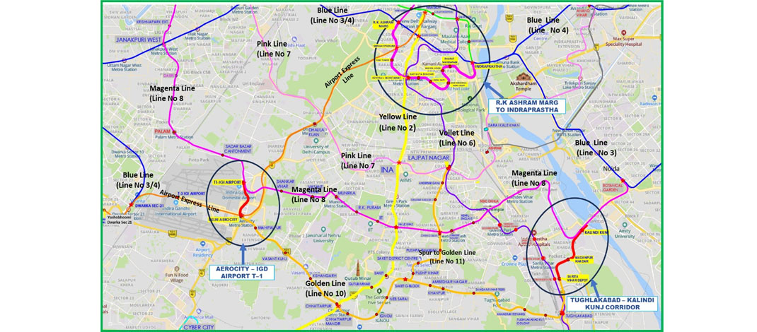 After completion, the corridor-1 namely R.K Ashram Marg to Indraprastha (9.913 Kms), will improve the connectivity of West, North and old Delhi with Central Delhi and the other two corridors namely Aerocity to IGD Airport T-1 (2.263 kms) and Tughlakabad to Kalindi Kunj (3.9 kms) corridors will connect south Delhi with the domestic Airport Terminal-1 via Saket, Chattarpur etc which will tremendously boost connectivity within National Capital.
