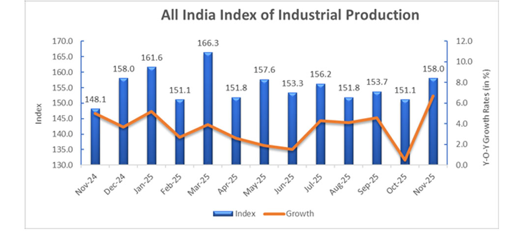 New Delhi : Driven by 8.0% growth in manufacturing sector, Index of Industrial Production (IIP) recorded a 6.7 % year-on-year growth in November 2025. The growth is led by Manufacture of basic metals and fabricated metal products, pharmaceuticals and motor vehicles