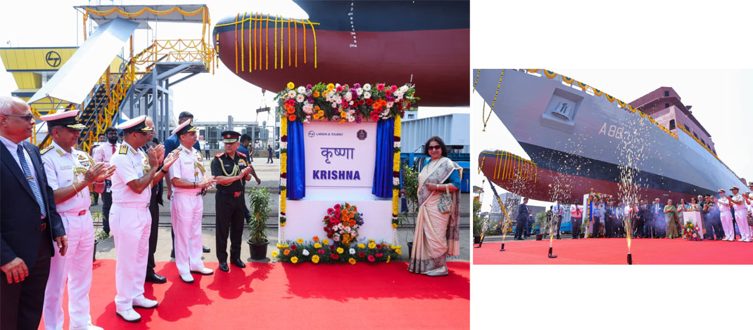 New Delhi : Yard 18003 (Krishna), the first of the three Cadet Training Ships (CTS) under construction at M/s L&T, Kattupalli (Chennai), has been launched on 16 Feb 2026. In keeping with the Naval traditions, Mrs Anupama Chauhan launched the ship in the presence of General Anil Chauhan, Chief of Defence Staff. Senior officials of the Indian Armed Forces and M/s L&T Shipbuilding, Chennai attended the event.