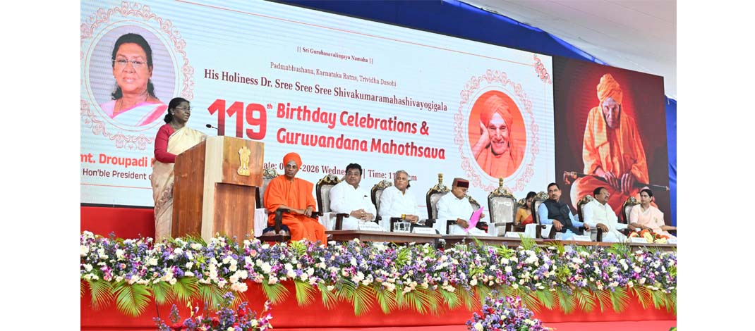 Addressing the gathering, the President said that saints like Sree Sivakumara Swamiji represent the very essence of India’s spiritual and social fabric. She noted that although the revered seer attained samadhi in 2019, his spiritual legacy continues to guide and uplift society. His lifelong commitment to serving the poor and underprivileged, she said, remains a shining example of spirituality expressed through welfare and humanitarian work.